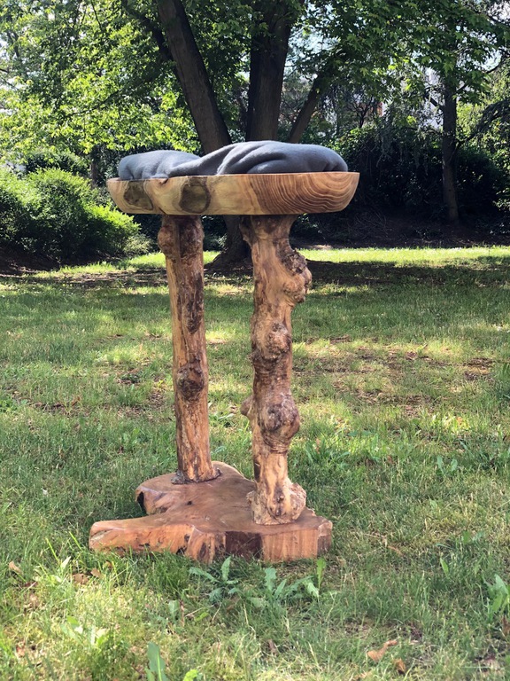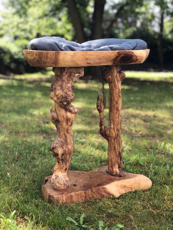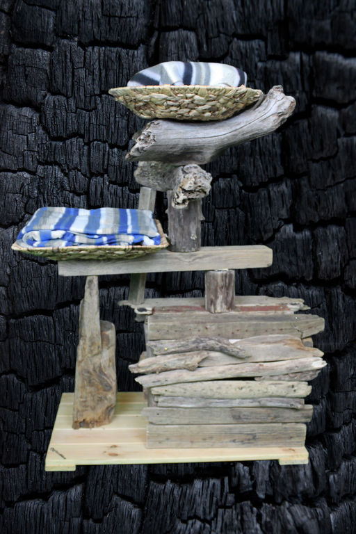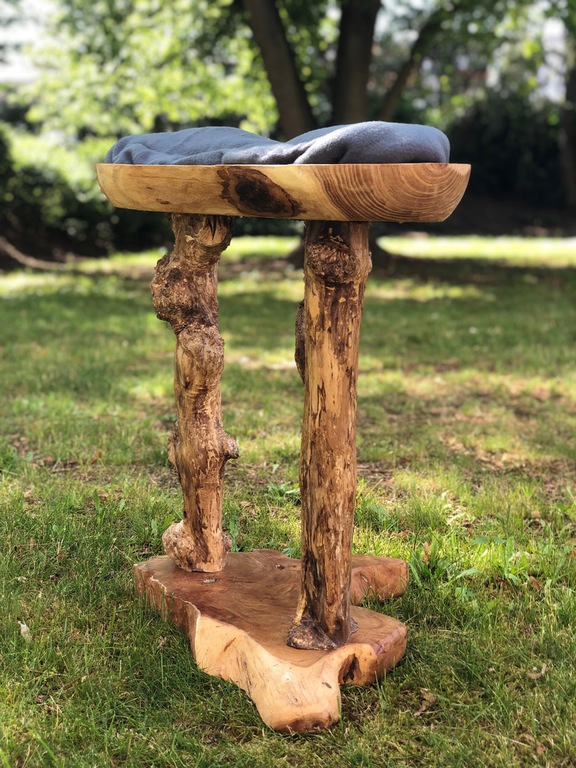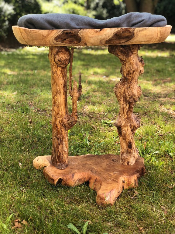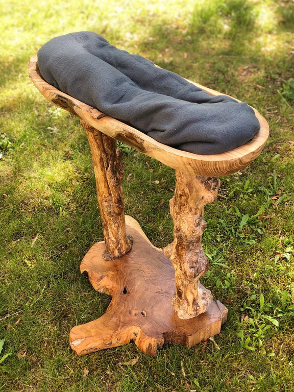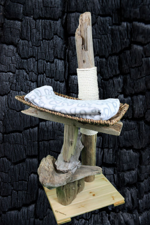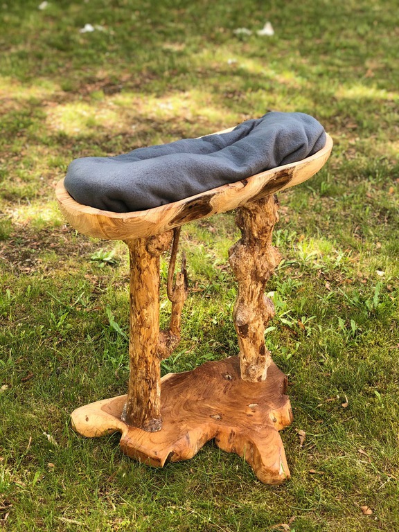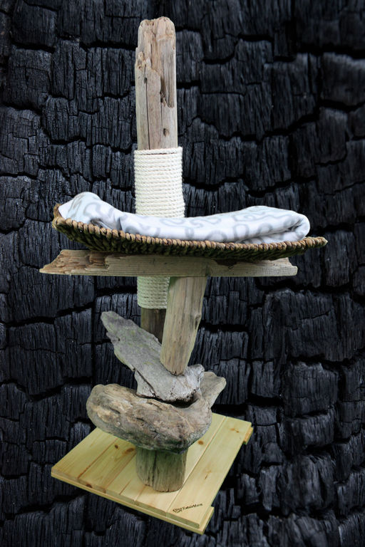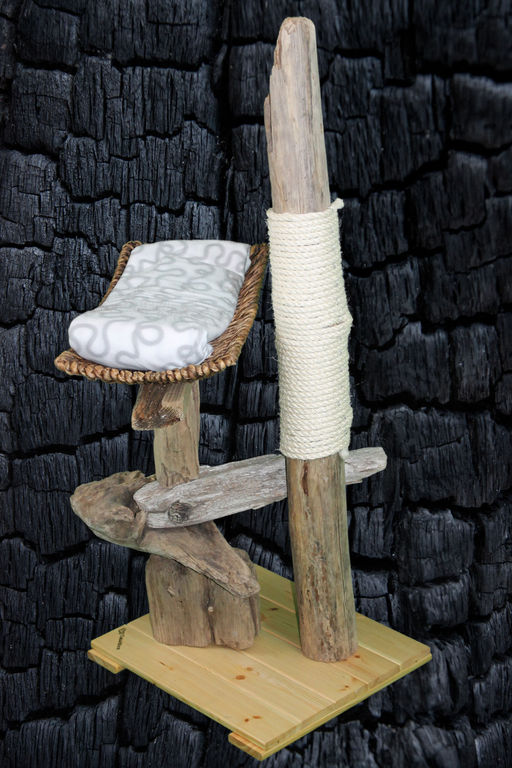 Toller kleiner Kratzbaum. Die Bodebplatte besteht aus einem Stück schwerer Teakholz Wurzel. Die Stämme sind aus dem Holz des Kaffeebaums. Beide Hölzer sind extrem hart. Die Liegeschale ist aus weicherem Holz gefertigt. Die Höhe ist ca. 60cm. Die Länge ebenfalls ca. 60cm und die Breite der Liegeschale ist ca. 24cm. Dazu gehört eine gemütliche Fliesdecke.